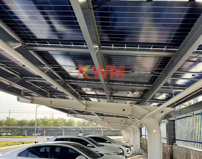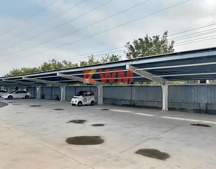 项目描述:该项目采用单排单向布局设计,以H型钢立柱作为主要承重结构,顶部与横梁通过高强度螺栓可靠连接。立柱采用孔洞优化设计,在保证力学性能的同时,兼顾视觉上的轻盈与美观。钢材表面施加镀锌加喷塑双重防护处理,显著提升其耐候性与抗腐蚀能力,确保在恶劣环境下长期稳定使用。